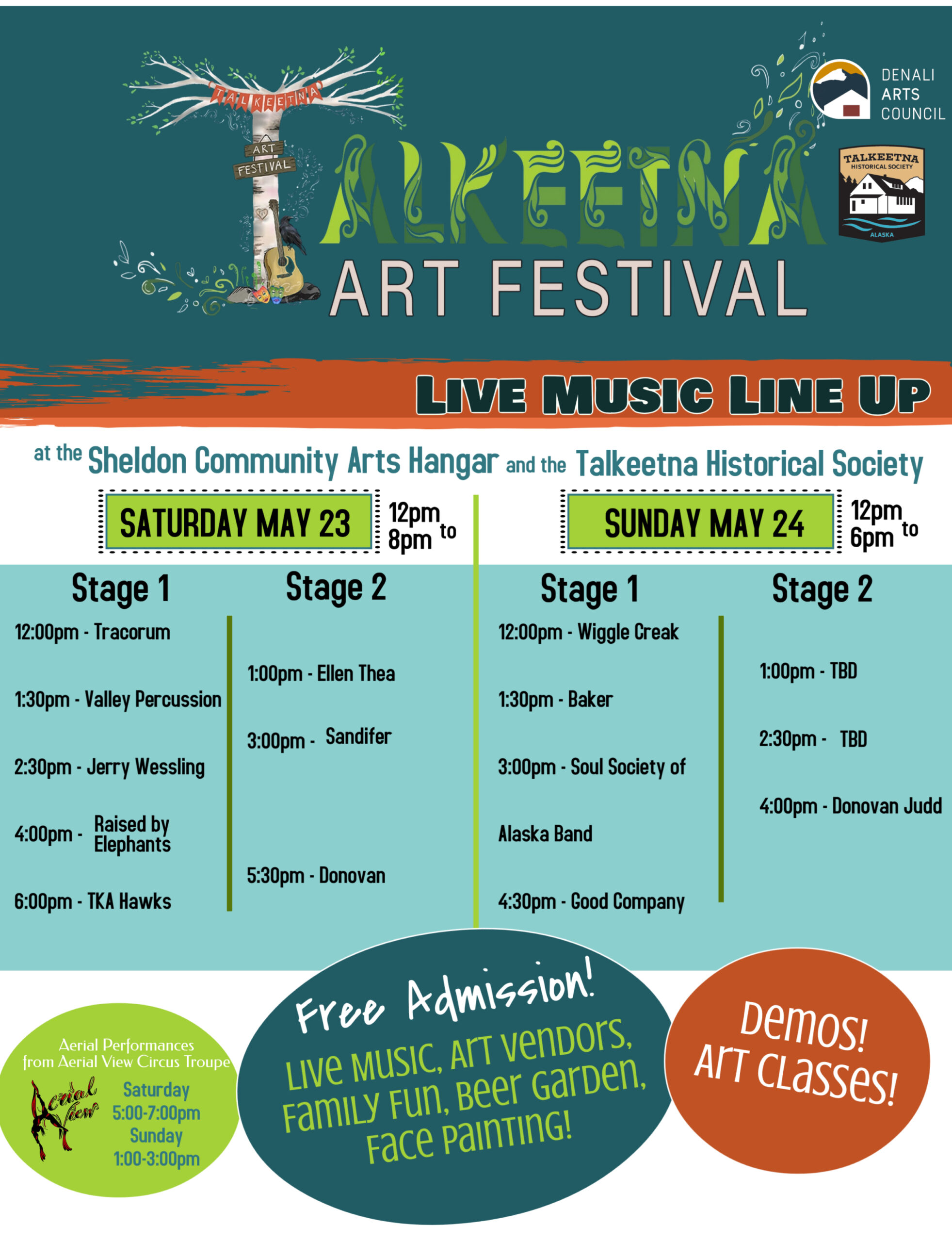 The 5th Annual Talkeetna Arts Festival is back Memorial Day weekend, May 23–24, and downtown Talkeetna is about to get loud. This year’s festival is packed with live music, featuring over a dozen bands performing all weekend long across two high-energy stages inside the Sheldon Community Arts Hangar.